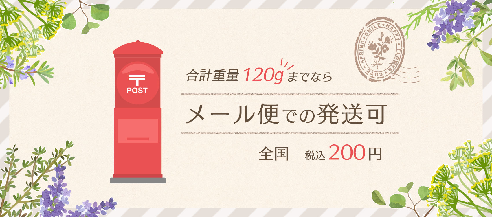 合計重量120gまでならメール便(全国200円)での発送が可能!