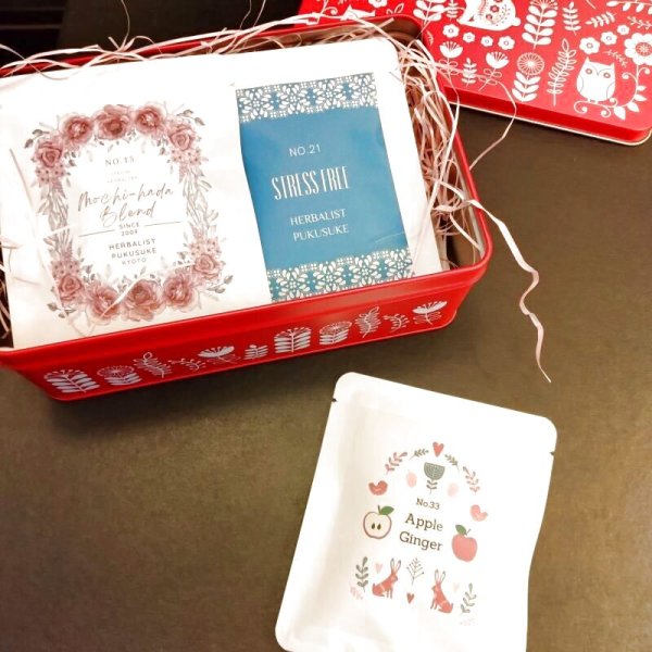 どなたにも気に入っていただけるぷくすけ自慢の10種類のハーブティーを一杯分ずつティーバッグにし、それぞれ意匠を凝らしたパッケージに個包装しました。いろんな味を楽しめるワクワクするときめきが詰まったギフト缶です。