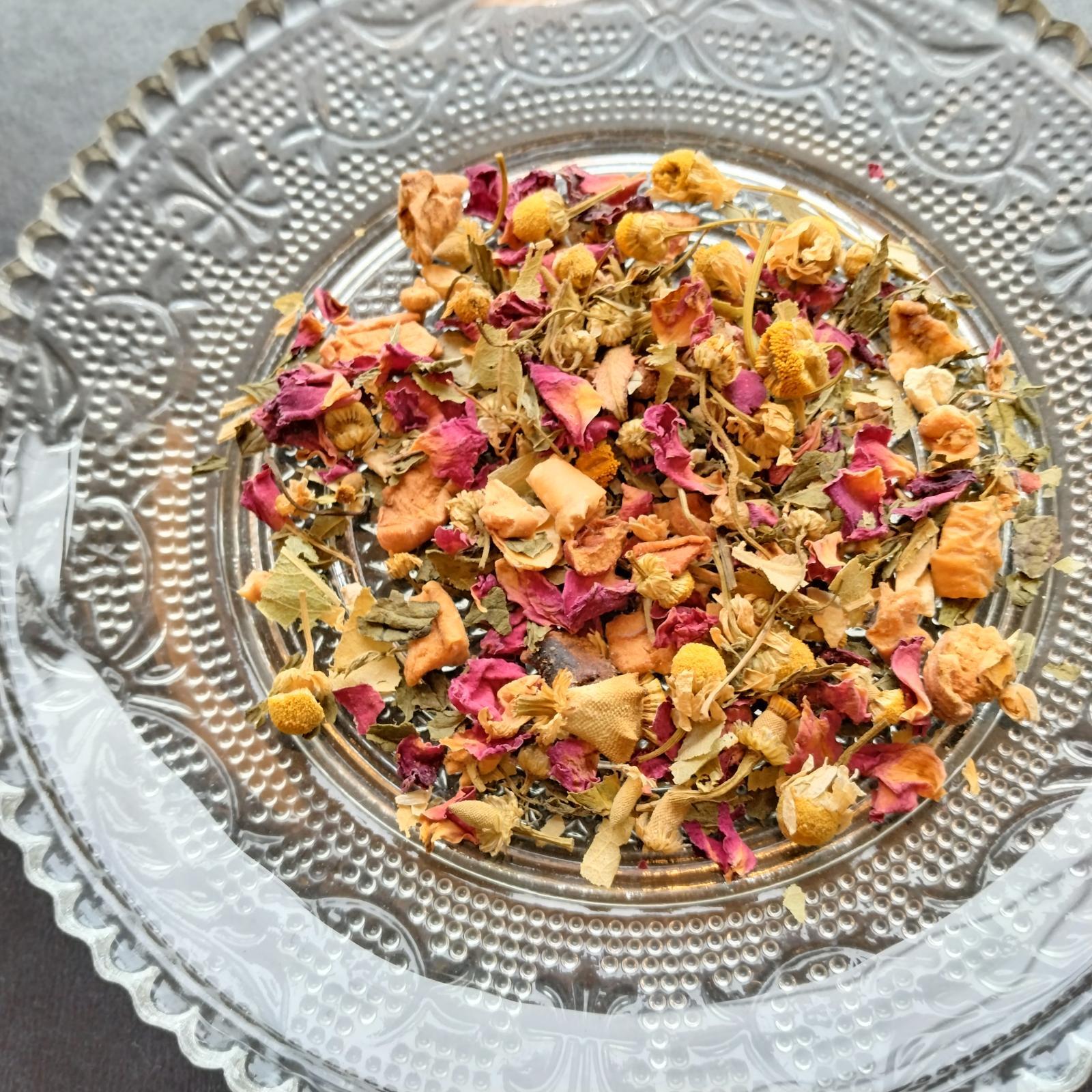 夜や休日など、ゆったりとした時間にぴったりの、優雅で癒されるブレンドティーです。 主役は、甘く安らぐ香りのカモミールと、華やかで女性に人気の薔薇(ローズ)。 さらに、じんわりと温かさを届けるジンジャーと、穏やかなリラックスハーブとして知られるリンデンとペパーミントを配合しました。